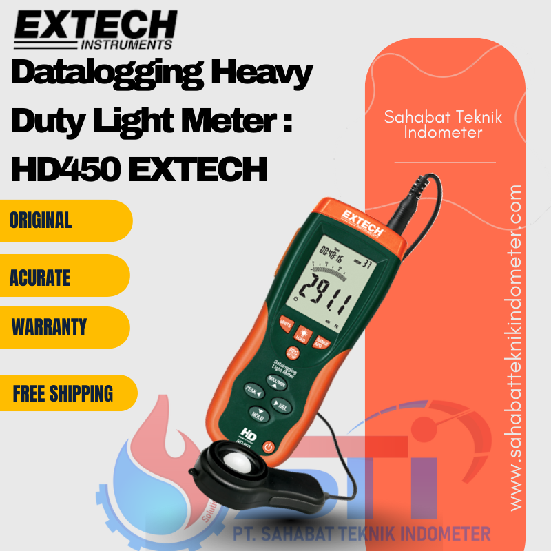 Datalogging Heavy Duty Light Meter: HD450 EXTECH adalah alat ukur tingkat pencahayaan yang dirancang untuk memenuhi kebutuhan pengukuran cahaya yang presisi dan berkelanjutan. Alat ini sering digunakan dalam industri, penelitian, dan bidang lain yang membutuhkan pengukuran intensitas cahaya secara akurat. Dengan kemampuan pencatatan data (datalogging) otomatis, HD450 EXTECH memungkinkan pengguna untuk merekam dan menganalisis data pencahayaan dalam jangka waktu tertentu.