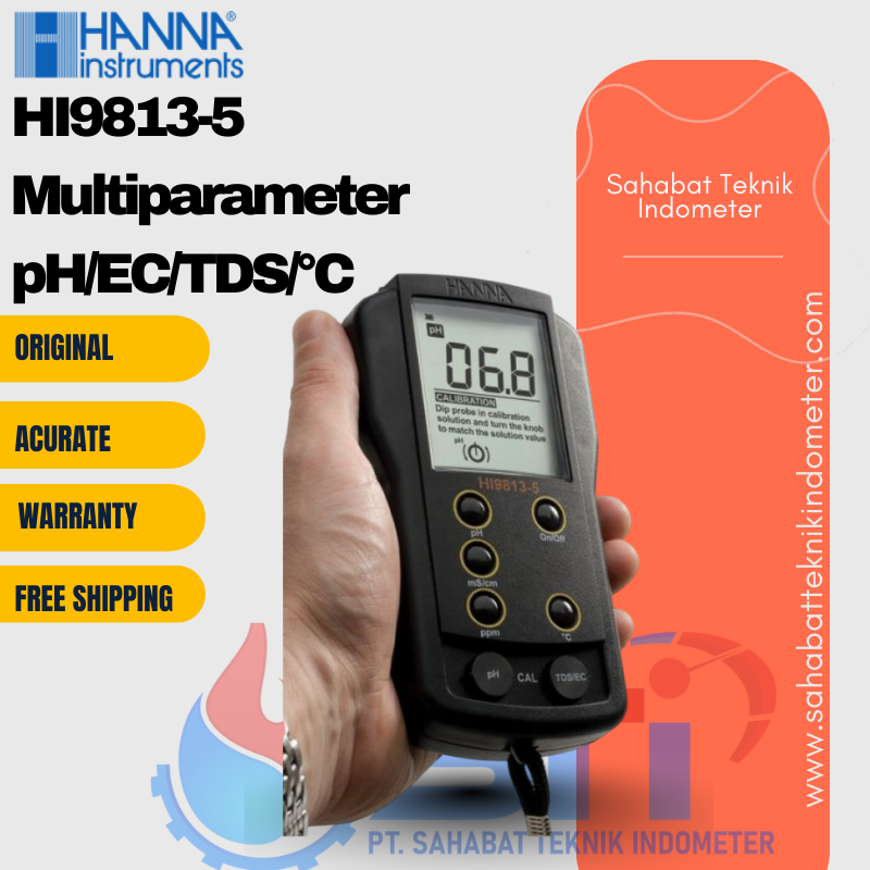 HI9813-5 Multiparameter adalah alat pengukur yang dirancang khusus untuk kemudahan dan efisiensi dalam memantau kualitas air. Alat ini mampu mengukur beberapa parameter sekaligus, termasuk pH, konduktivitas listrik (EC), kelarutan total zat padat (TDS), dan suhu (°C). Dengan fitur serbaguna ini, HI9813-5 menjadi solusi ideal bagi sektor agrikultur, hidroponik, hingga proses industri yang bergantung pada akurasi analisa air. Semua fungsi alat ini dikemas dalam desain yang ringkas dan user-friendly, menjadikannya pilihan utama untuk berbagai keperluan pengukuran.