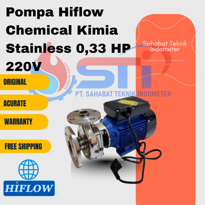 Pompa Hiflow Chemical Kimia Stainless 0,33 HP 220V adalah pilihan ideal untuk memenuhi kebutuhan pemindahan cairan kimia secara efektif dan aman. Dengan daya motor sebesar 0,33 HP dan tegangan 220V, pompa ini dirancang khusus untuk memberikan performa yang optimal pada berbagai aplikasi industri maupun rumahan. Material stainless steel berkualitas tinggi memastikan daya tahan produk terhadap korosi serta kompatibilitas dengan berbagai jenis cairan kimia.
