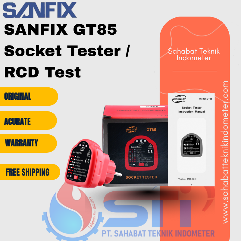 SANFIX GT85 Socket Tester / RCD Test adalah alat yang dirancang untuk memeriksa kondisi soket listrik dan fungsi Residual Current Device (RCD) secara akurat dan efisien. Produk ini cocok untuk teknisi listrik maupun pengguna rumahan yang ingin memastikan keamanan instalasi listrik mereka. Dengan desain yang sederhana namun lengkap, SANFIX GT85 mempermudah identifikasi masalah listrik seperti kabel putus, grounding tidak baik, atau fungsi RCD yang tidak optimal.