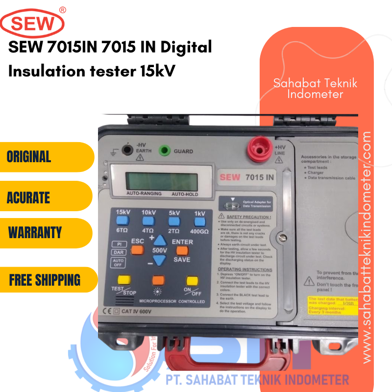 SEW 7015 IN Digital Insulation Tester Summary 7015 IN Instrument Type: digital Test Voltage: 500V~15kV Insulation Resistance: 0 ~ 2T Additional Functions: AC voltage measurement, DC voltage measurement, polarization index (PI), dielectric absorption ratio (DAR) Additional Features: auto circuit discharge, counting timer, display with bargraph, display with backlight, external voltage warning, live circuit warning, low battery indicator Features Microprocessor-controlled. 2 Lines x 16 characters large intelligent LCD module 30 Insulation test voltages 500V, 1kV, 1.5kV, 2kV, 2.5kV, 3kV, 3.5kV, 4kV, 4.5kV, 5kV, 5.5kV, 6kV, 6.5kV, 7kV, 7.5kV, 8kV, 8.5kV, 9kV, 9.5kV, 10kV, 10.5kV, 11kV, 11.5kV, 12kV, 12.5kV, 13kV, 13.5kV, 14kV, 14.5kV, 15kV AC / DC Voltmeter. Menu driven. Short-circuit current up to 5mA PI (Polarization Index) indication DAR (Dielectric Absorption Ratio) indication Auto-ranging on all insulation ranges Optical USB to RS-232 data transmission Well isolated to contact. Well surge protection 2 optical LEDs are built-in for data transfer Bargraph indicates test voltage, rise and decay can be observed. Backlight function Visual and audible warning if external voltage is present ( gt;30Vac or 30Vdc) Auto-hold function to freeze the reading. Overload protection Adjustment for testing time (duration): 1~30 minutes. Calendar. Internal memory for data storage Indication of testing time (duration) for insulation measurement. Auto-off function Scope of delivery 7015 IN Digital Insulation Tester 7015 IN Instruction manual Test leads (AL-58, AL-30AG, AL-30HB, AL-23CA) Data transmission cable CA-232 Compact disk (CD) for PC interface Alligator clip (AL-23CA) Charger (CHA-7010) Test report