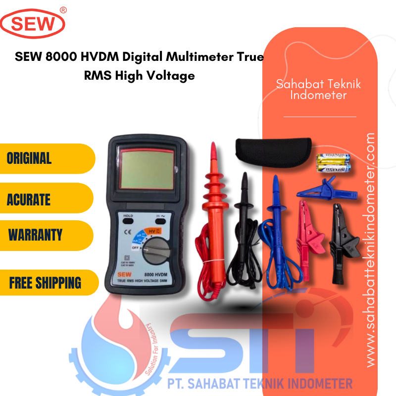 Sew 8000 HVDM Digital Multimeter True RMS High Voltage adalah alat ukur yang dirancang khusus untuk melakukan pengukuran listrik pada tingkat tegangan tinggi. Alat ini dilengkapi dengan teknologi True RMS, yang memungkinkan pengukuran akurat pada sinyal yang tidak sinusoidal. Multimeter ini sangat penting dalam berbagai aplikasi teknik dan industri, khususnya yang berhubungan dengan peralatan elektrik dan instalasi yang memerlukan pengukuran voltase tinggi.