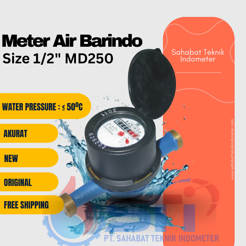 Water Meter Barindo MD250 Size 1/2″ menawarkan solusi efisien untuk mengukur konsumsi air dengan desain yang kompak dan akurasi tinggi. Dibuat dari material berkualitas tinggi, alat ini dirancang tahan lama serta mampu memberikan pengukuran yang konsisten dan andal. Alat ini cocok untuk penggunaan rumah tangga maupun komersial, memenuhi kebutuhan pengukuran air dengan standar profesional.